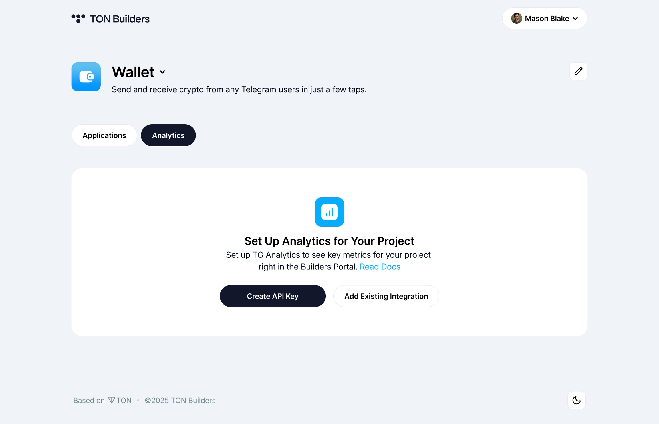 Enter your Telegram Bot URL and mini app domain to receive an API key for SDK initialization. You can also manage your existing keys from the same section. Enter your Telegram Bot URL and mini app domain to receive a token for SDK initialization.